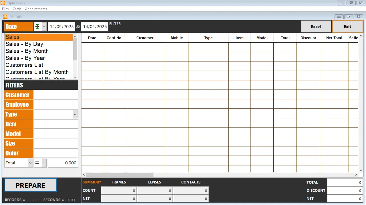 يختص البرنامج بمحلات البصريات حيث يقوم بفكرته الأساسية على تنظيم وأرشفة بيانات العملاء ونتائج الفحوصات الخاصة بهم بالاضافة لمشترياتهم ما يشكل بالنهاية أرشيفاً كاملاً لكافة العملاء بين يديك دوماً